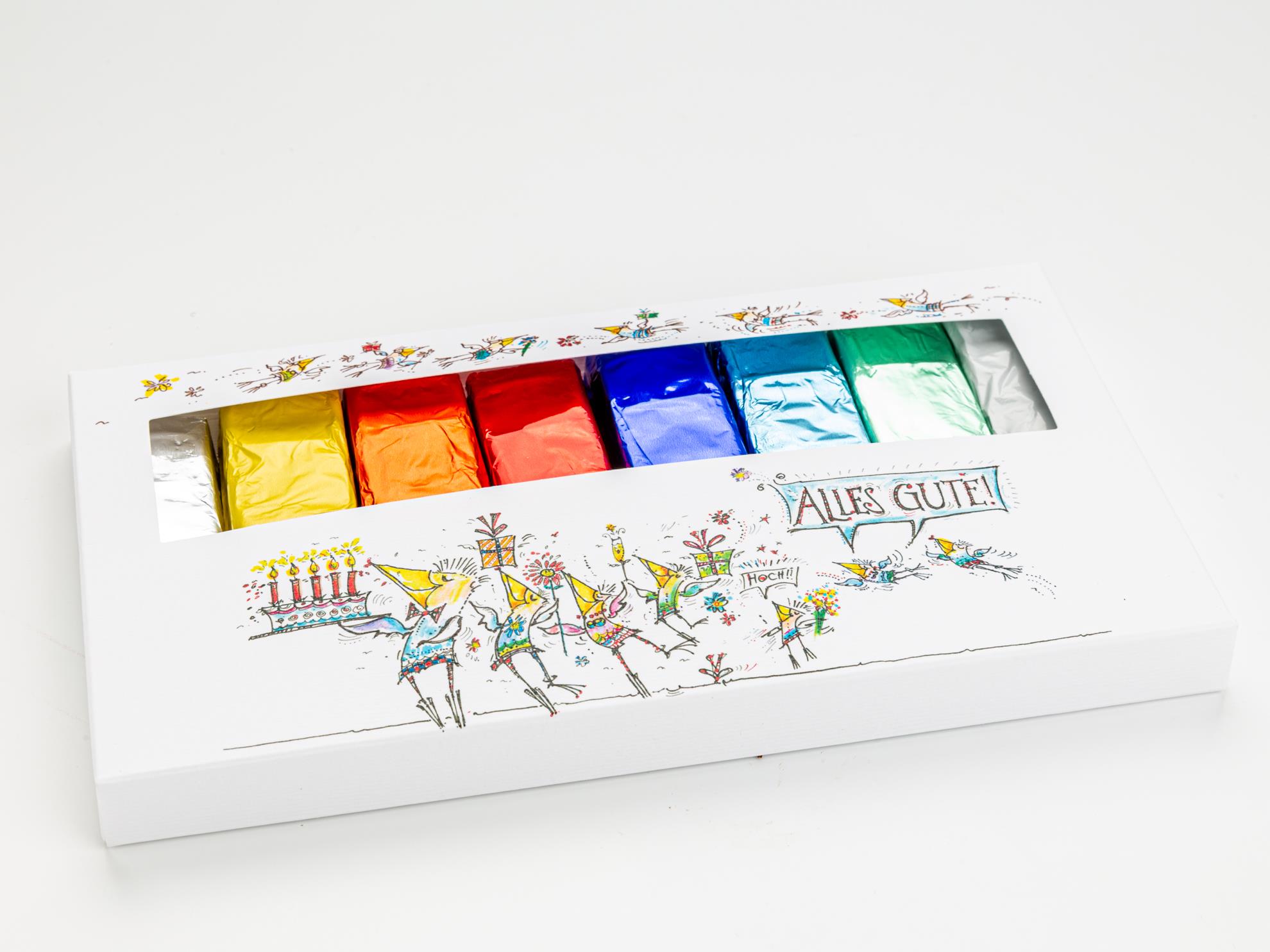 Dunkelblau: Haselnuss-Gianduja dunkel HASELNÜSSE, Zucker, Kakaomasse, Kakaobutter, VOLLMILCHPULVER, MAGERMILCHPULVER, Vanille