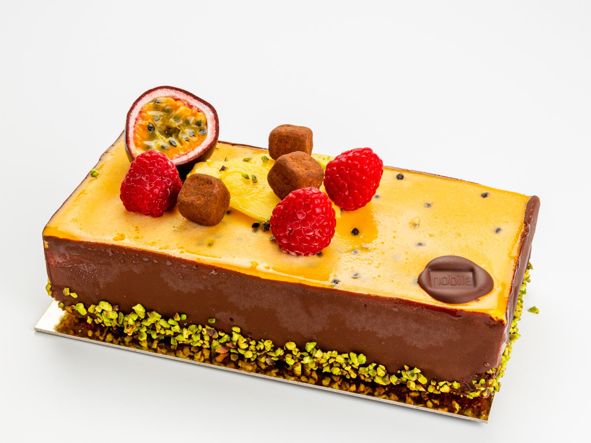 Mango, Himbeeren, Zucker, Wasser, RAHM, Couverture (Kakaokerne, Kakaobutter, Zucker, Vanille), EIWEISS, Passionsfrucht, Erdbeeren, EIGELB, Glukosepulver, PISTAZIEN, Zitronensaft, Bindemittel (Johannisbrotkernmehl), Pektin, Vanilleschoten.