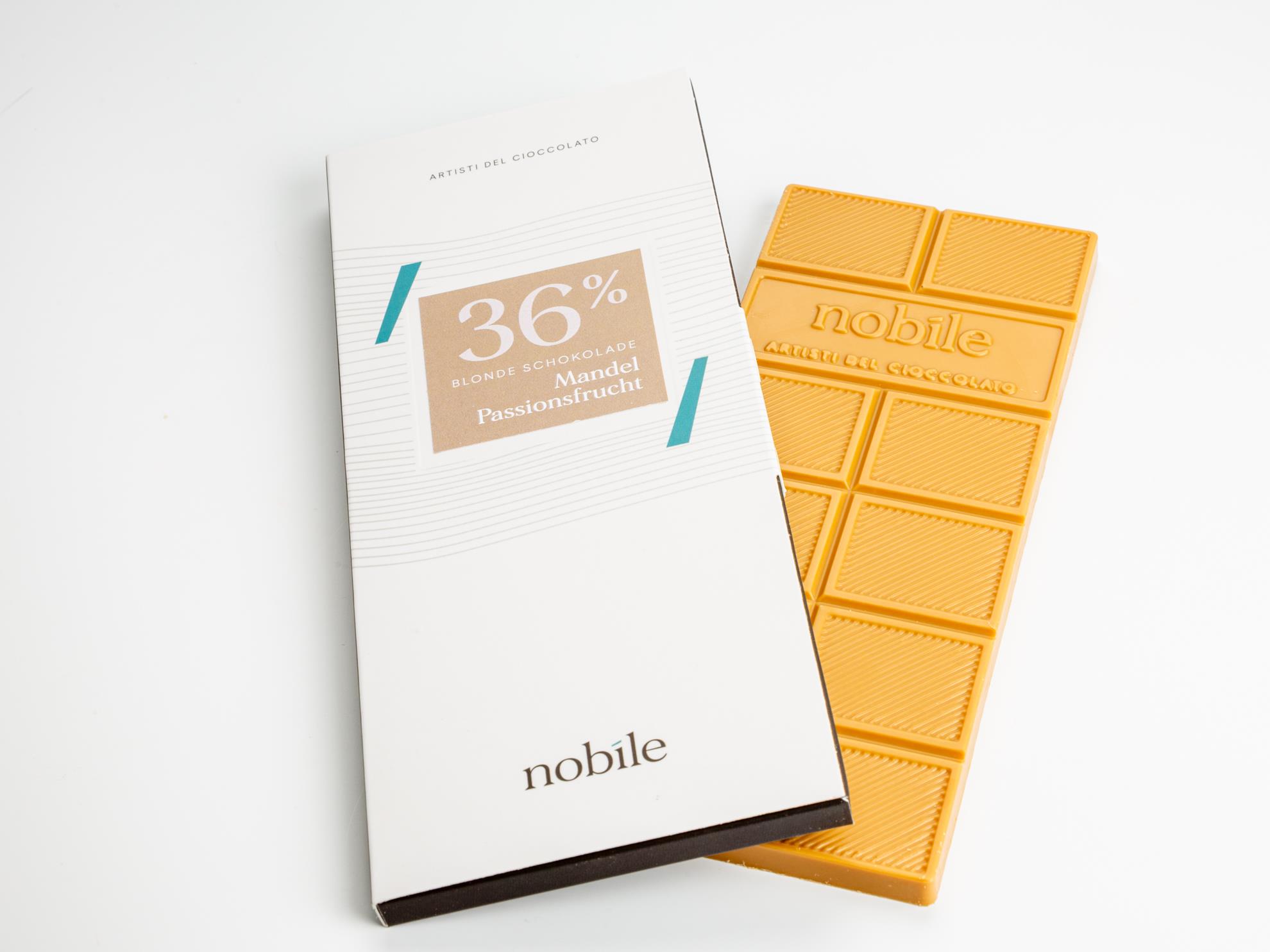 Blonde Caramel-Schokolade mit Mandeln und Passionsfrucht, abgeschmeckt mit einer Prise Sapir-Salz und rotem Kampot-Pfeffer